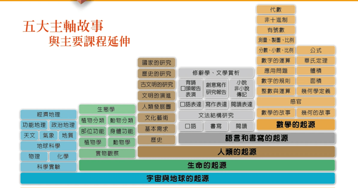 宇宙和地球形成的故事、生命起源的故事、人類的起源、語言和書寫的起源、數學的起源。通過這五大主軸故事的穿插引述,建構出以:科學、數學、社會研究、及語言為探索的架構。